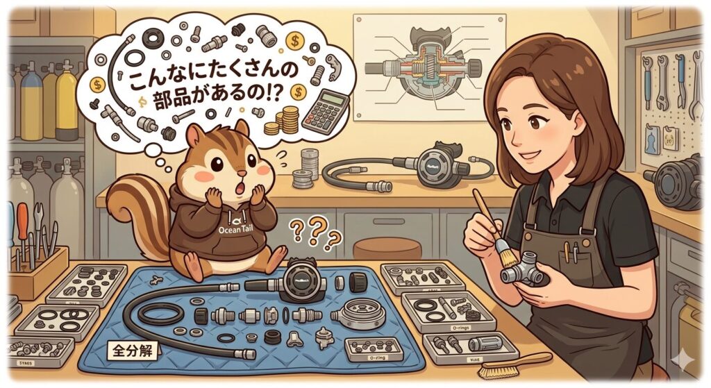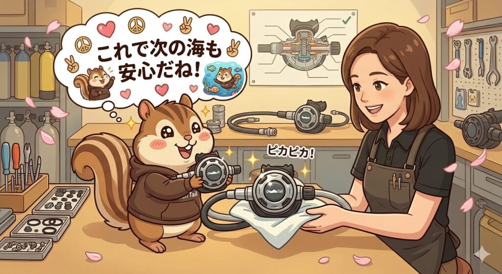 「テイル、水中で空気が吸いにくくなったり、逆に止まらなくなったりしたらパニックになっちゃうでしょ?だから、目に見えるトラブルが起きる前に、中身をリフレッシュさせてあげることが、ダイバーとして一番大切な準備なんだよ」
